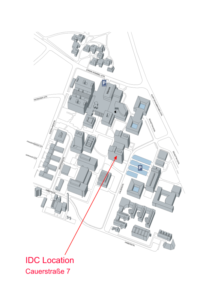 The IDC offices are located on FAU’s South Campus in one of the two electrical engineering towers. Most offices are situated on the 4th and 5th floors of Cauerstraße 7 in Erlangen.